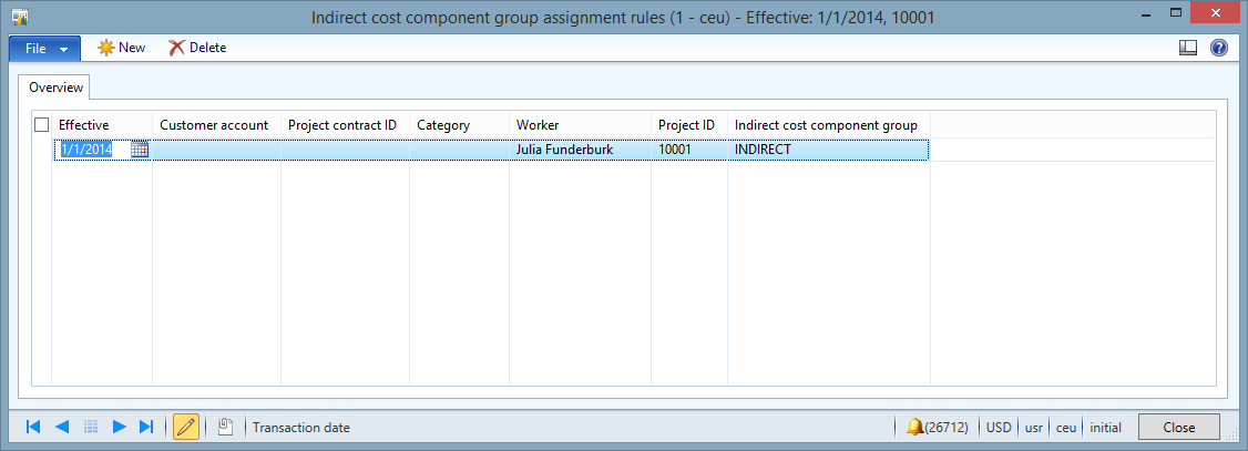 - The final form for indirect cost components is the indirect cost component group assignment rules form, which is used to assign an indirect cost component group to a worker, project, or both. Go to Project management and accounting | Setup | Indirect costs | Indirect cost component group assignment rules. Enter an “Effective” date, and select our cost component group that we created for the “Indirect cost component group”. You can specify specific workers, contracts, categories, projects, customers, or any combination to activate the indirect cost components. Close the form.
