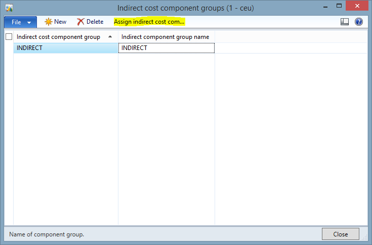 - The next form is the indirect cost component groups. This form stores the calculation methods, rates, and rules for calculating the indirect costs. Go to Project management and accounting | Setup | Indirect costs | Indirect cost component groups. Click “New”, and enter a name for both the “Indirect cost component group” and “Indirect component group name”. Ctrl+S to save the record, then click “Assign indirect cost components”.