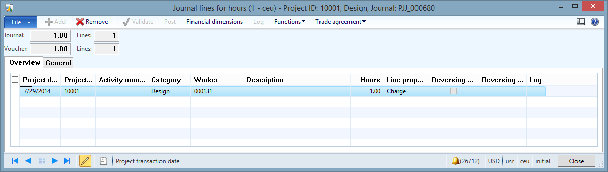 To test the indirect cost component, I posted a project hours journal to project 10001 for Julia Funderburk: