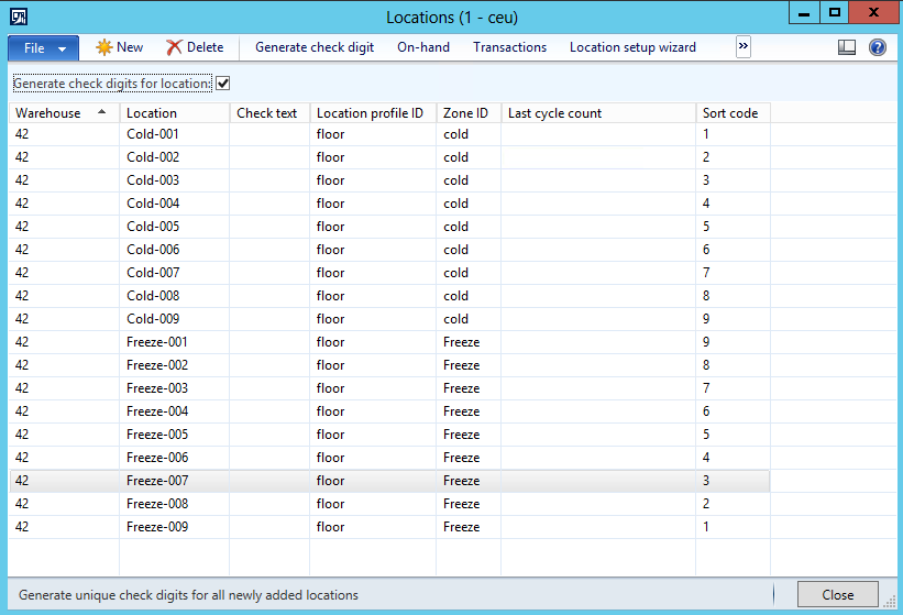 I’ve created locations for cold and freeze zones (Cold-001 through Cold-009, and Freeze-001 through Freeze-009) in warehouse 42. Then I assigned the appropriate zones to them.