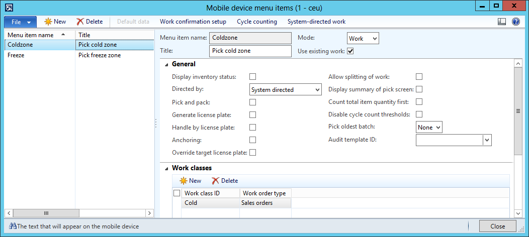 - Warehouse management > Setup > Mobile device > Mobile device menu items