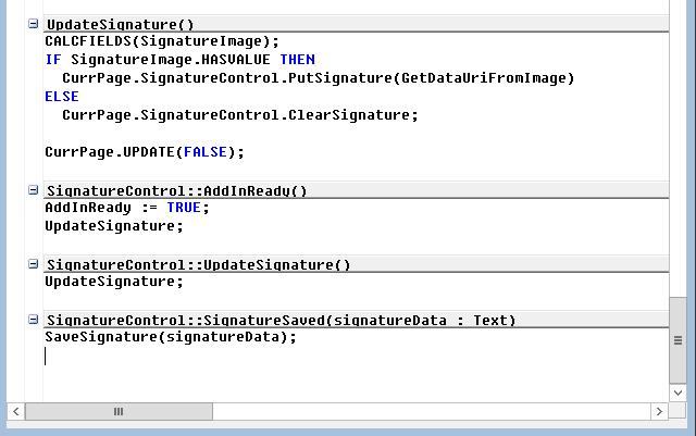 On the server side, besides the usual AddInReady event, we will need two more events; one to write the signature data: the SaveSignature and one to read the signature from the Microsoft Dynamics NAV table to trigger an update on the page; the UpdateSignature.