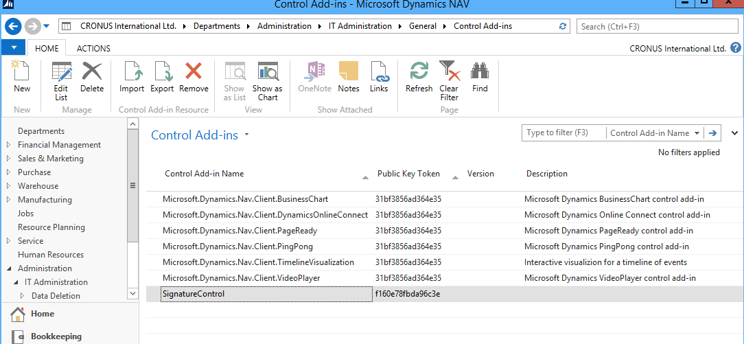 Open any of the Microsoft Dynamics NAV clients (Windows, Web or Tablet) and go to the Control Add-ins page. Create a new entry named SignatureControl and enter the public key token that you saved earlier. Import the zip file.