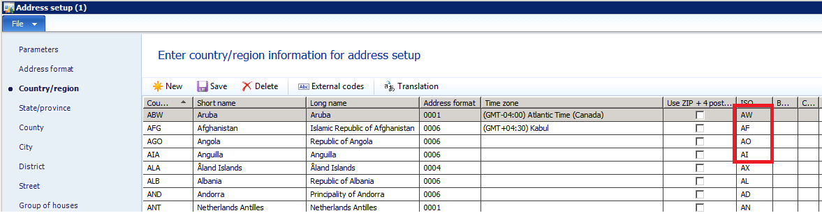 To correct these invalid ISO codes, go to Organization Administration > Setup > Addresses > Address setup and click the Country/region link.