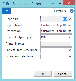 When the user chooses Schedule on the request page, the report is not executed immediately. Instead, the codeunit 1 function ReportScheduler@79(ReportId:Integer;RequestPageXml:Text):Boolean is called, where the ReportId parameter specifies the report’s ID and the RequestPageXml parameter specifies the request page parameters as an XML string. This function creates a new record in table 472 Job Queue Entry where it stores the RequestPageXml parameter value (the Job Queue Category Code field is left blank). Before the function inserts the new record in the Job Queue Entry table, page 682 Schedule a Report opens in the client and enables the user to choose the report output type and when to run the report. The following figure illustrates an example of the Schedule a Report page for the report 111 Customer Top 10.