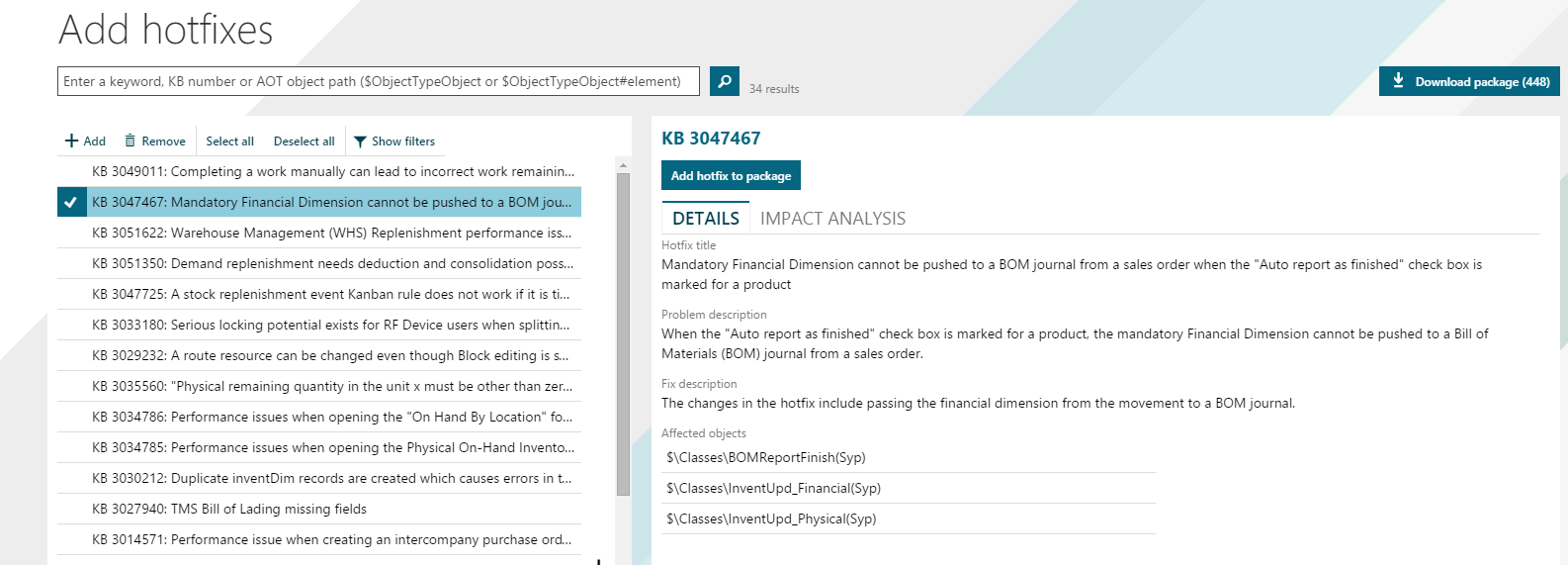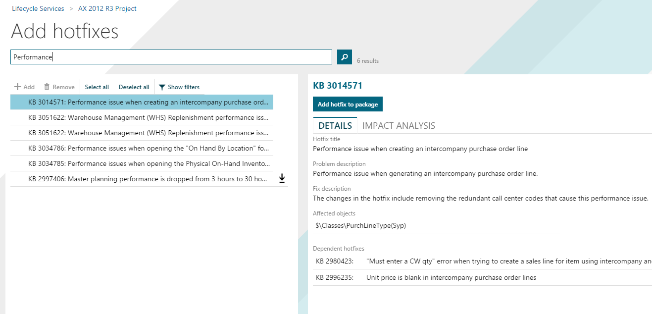 You can select an update and click the Impact analysis tab to see the impact of each hotfix on your customizations. For example, if a class has been customized in your environment and if a hotfix affects that class, one class is listed as impacted.