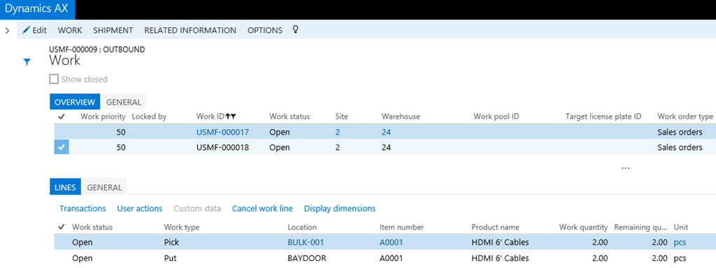 The load will be outbound processed within the warehouse via two work headers.