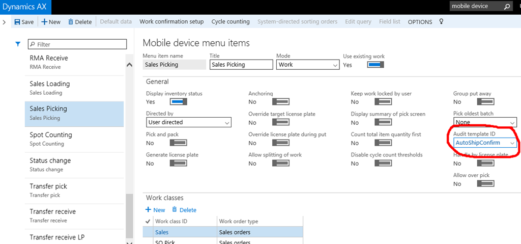The mobile device menu item that’s used as part of the outbound warehouse work processing has been enabled to use the defined Audit template ID.