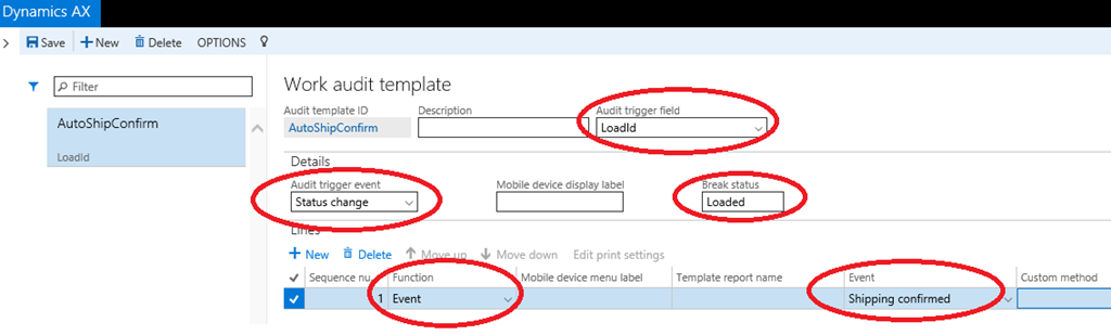 To enable the scenario above, a Work audit template record has to be created to trigger the event of running the Shipping confirmed update as soon as the status for a load is updated to Loaded. This can be achieved with the setup seen below.