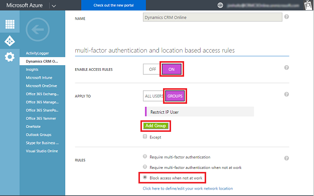 You can restrict access to all Users or groups of users. It’s more efficient to restrict by a group if only a subset of your Azure Active Directory (AAD) users are accessing CRM Online.