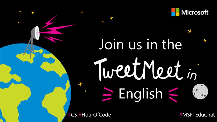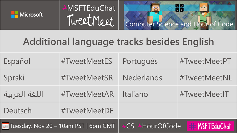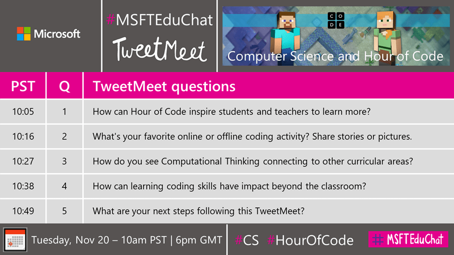 Join us Tuesday, November 20 from 10 a.m. to 11 a.m. PDT on Twitter using the hashtags #MSFTEduChat, #CS, #HourofCode, #CSEdWeek and #MicrosoftEDU (which you can always use to stay in touch with us). To find the event time for your specific location, use this time zone announcer.