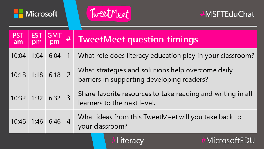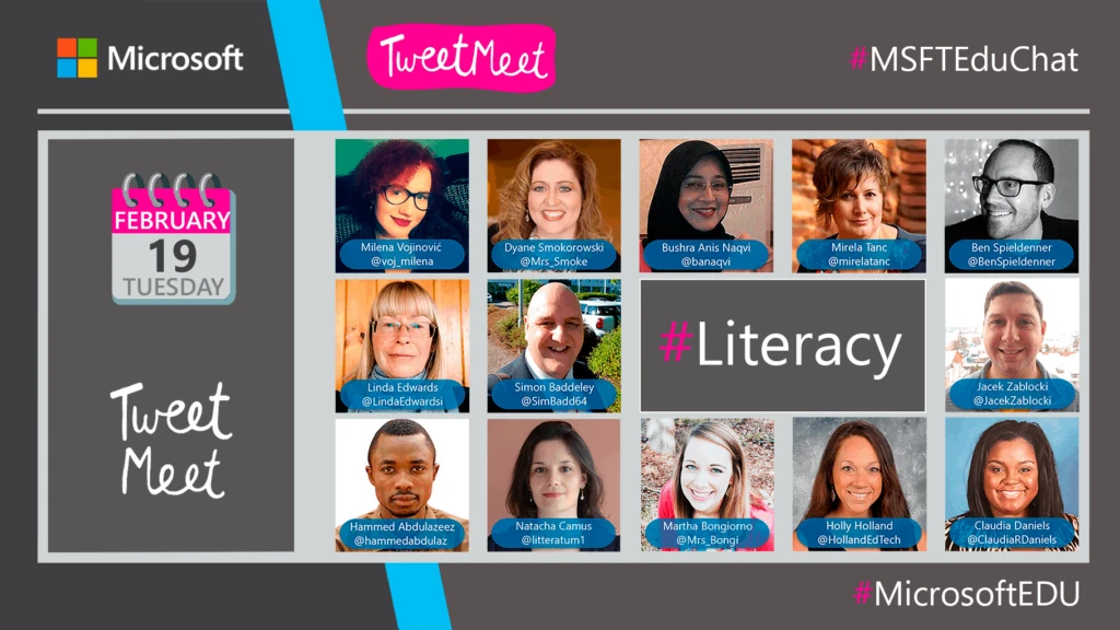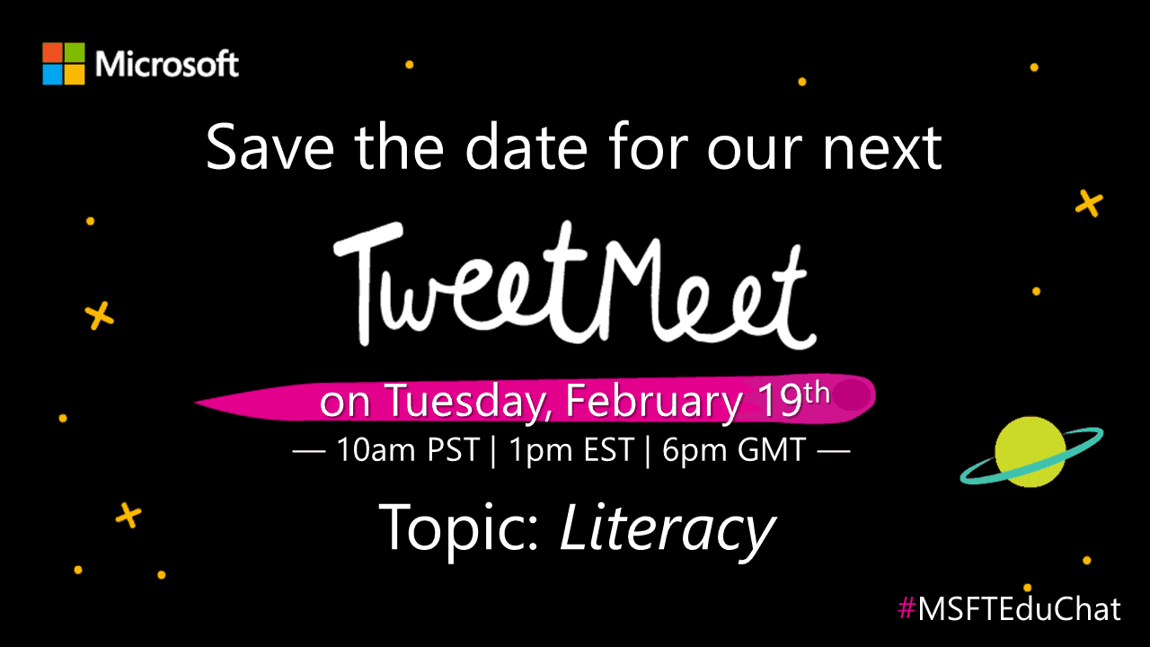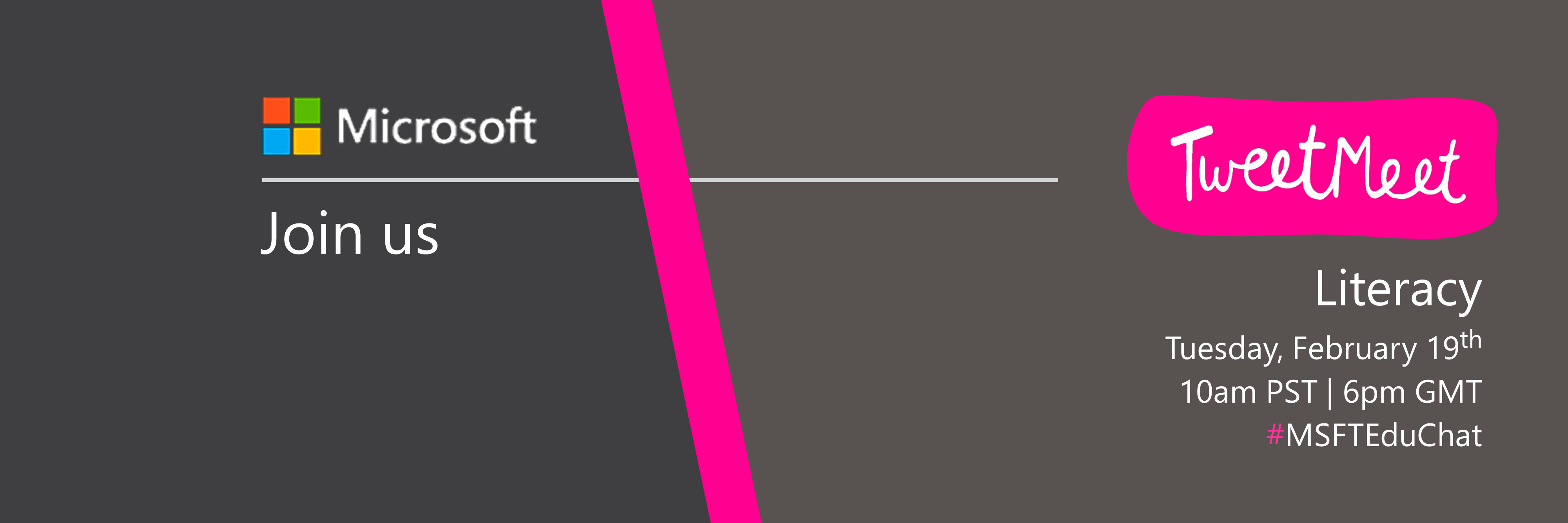 Join us Tuesday, February 19 from 10 a.m. to 11 a.m. PST on Twitter using the hashtags #MSFTEduChat, #Literacy and #MicrosoftEDU (which you can always use to stay in touch with us). To find the event time for your specific location, use this time zone announcer.