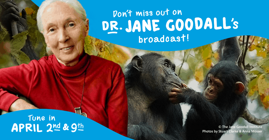 The broadcasts will air on April 2nd at 12:30 ET/17:30 UTC and April 9th at 9:00 ET/14:00 UTC and each will be followed by a 30-minute live chat with Dr. Jane Goodall and the Jane Goodall Institute Roots & Shoots team.