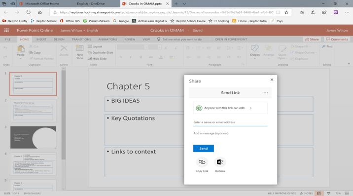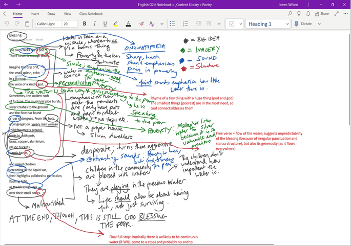 In the second year of my OneNote experiment, I was given a ‘top set’ Year 11 (second year of GCSE)—a high-ability group with whom I could afford even more latitude to experiment with ‘flipped’ learning styles in preparing them for their Literature GCSE exam. I began to do less curating of material in the Content Library and started to ask them to generate their own resources. I scaffolded annotation tasks in the Collaboration Space and had them collaborate on PowerPoint or Word docs (shared from OneDrive). They would then copy and paste them into the Content Library pages, which effectively gave the students a repository of shared research and note-taking experience.