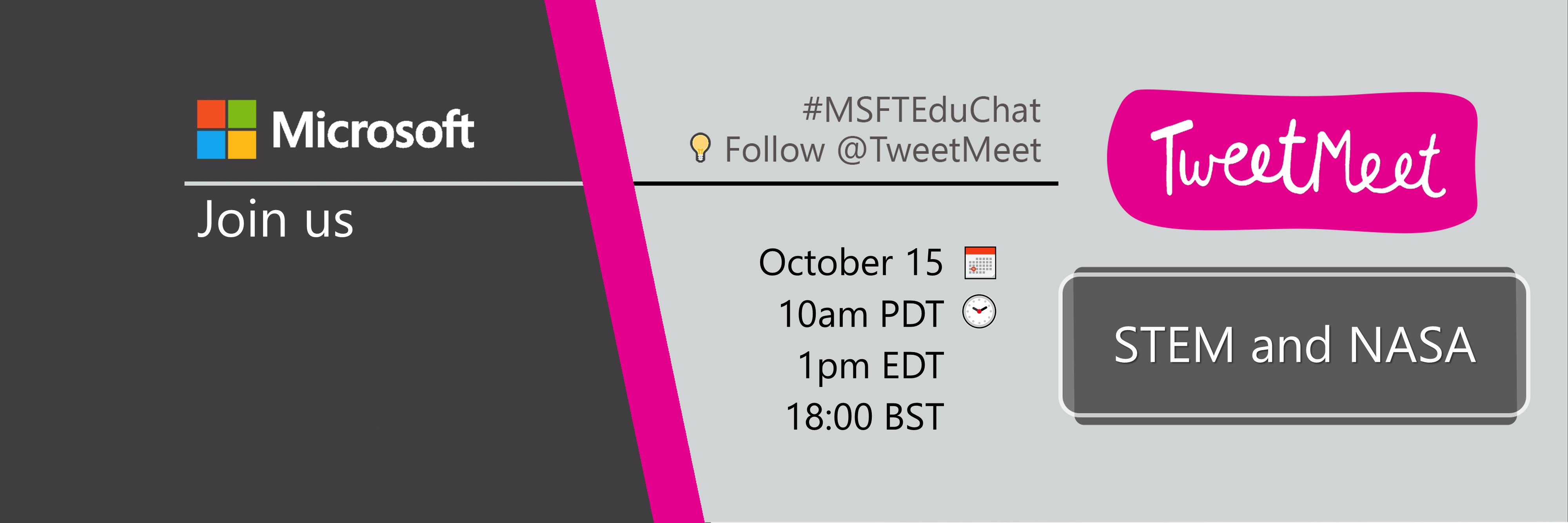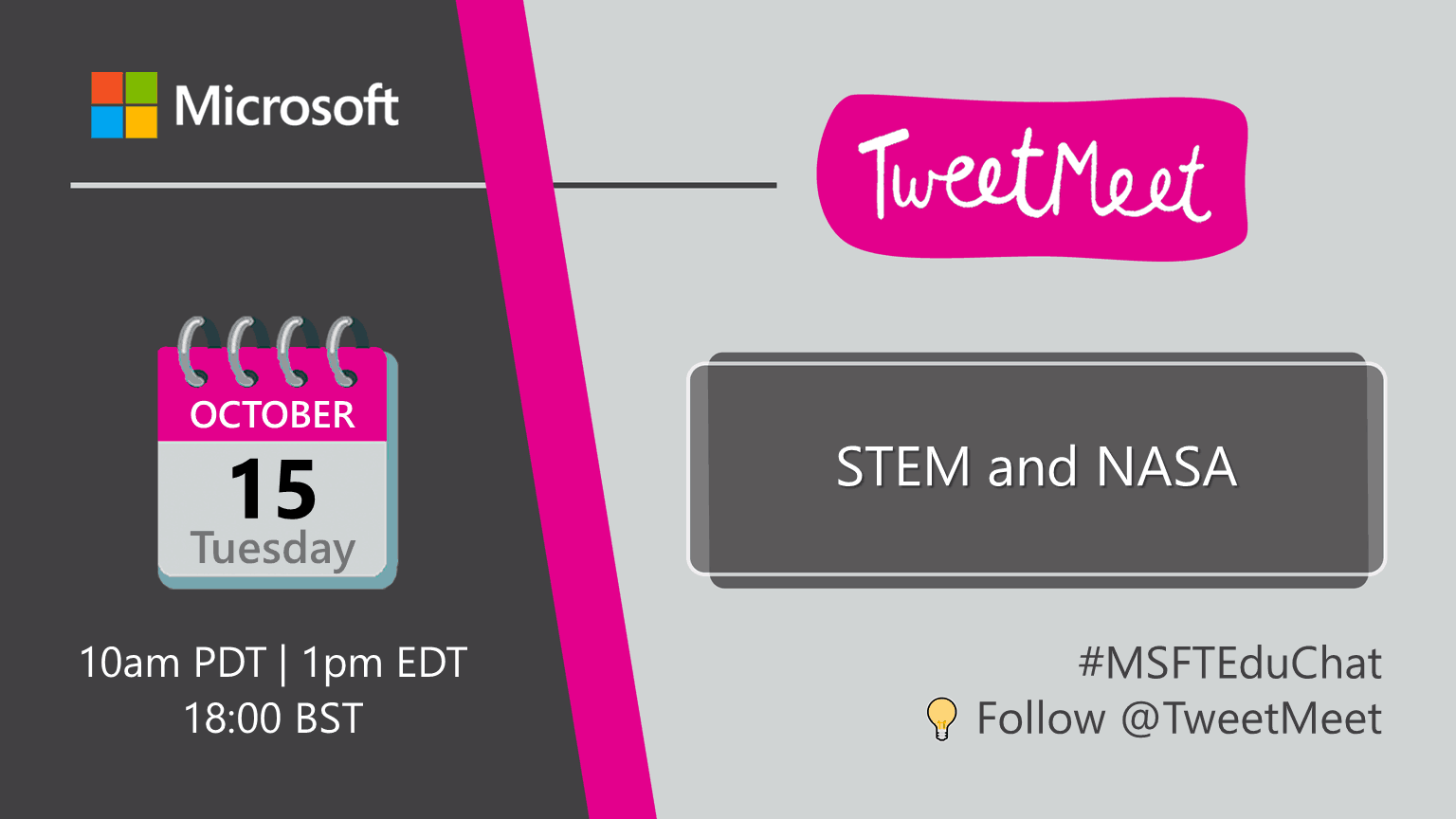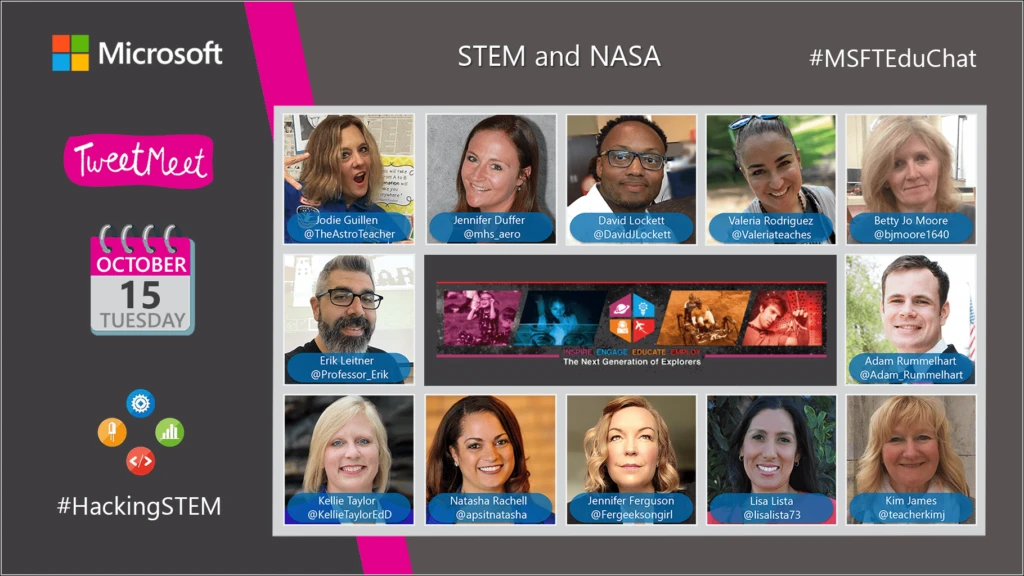 Join us Tuesday, October 15 from 10:00 a.m. to 11:15 a.m. PDT on Twitter using the hashtags #STEM,#HackingSTEM, #SpaceEd, #NASA, #MSFTEduChat and #MicrosoftEDU (which you can always use to stay in touch with us). Be sure to double-check your own local event time. You can find the event time for 215 countries with this time zone announcer.