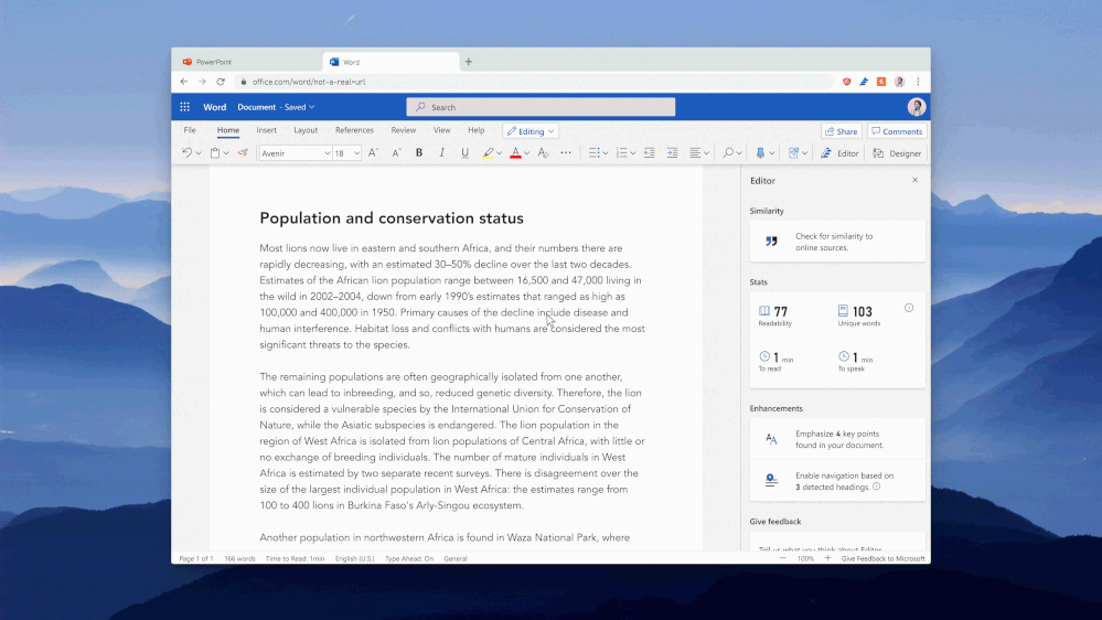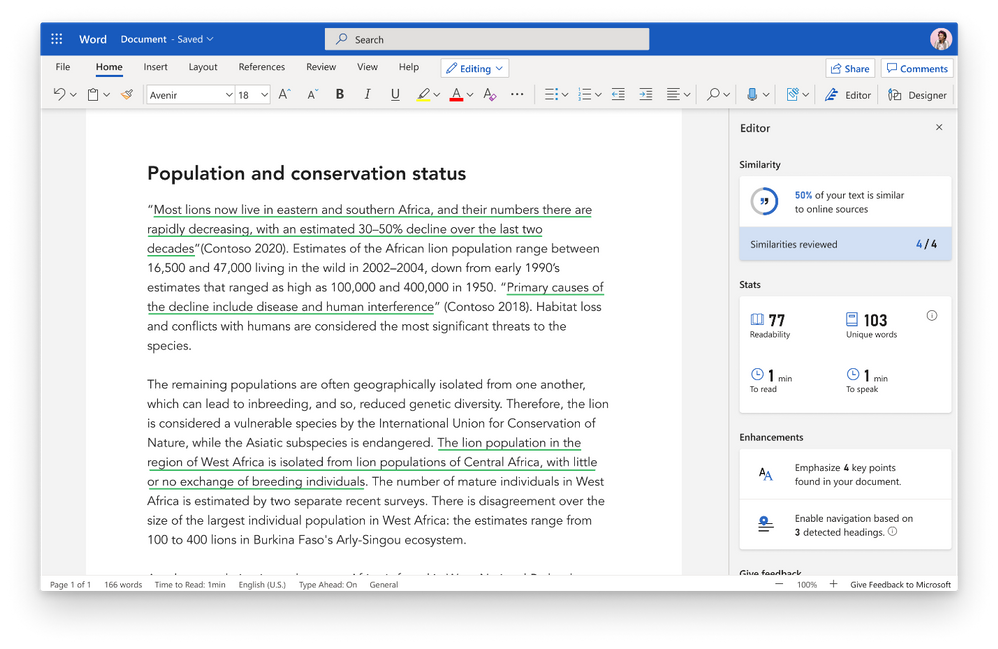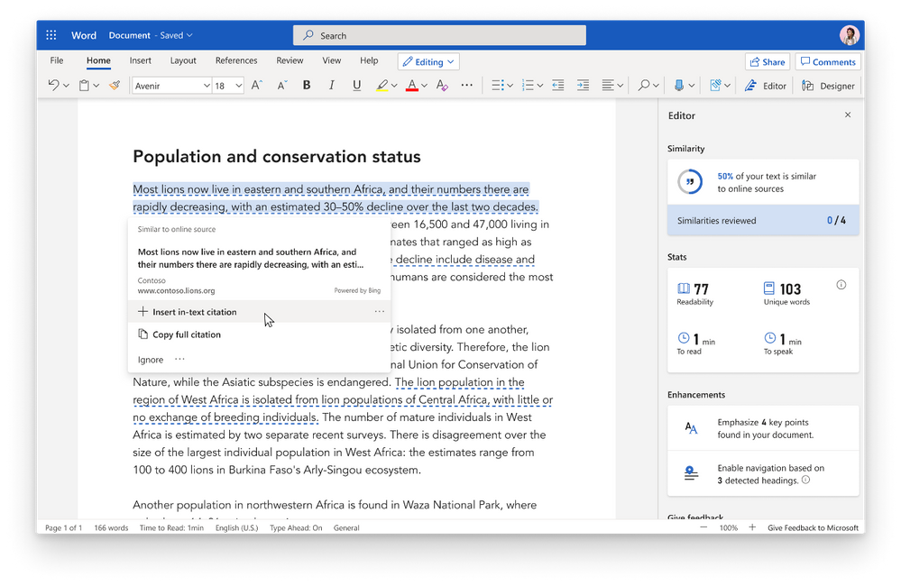 Powered by Bing Search, the Similarity checker can identify and help writers with originality in their writing and learn more about appropriate attribution through tools that facilitate the easy insertion of relevant citations. This can aid writers in focusing less on the mechanics of writing, and more on the content.