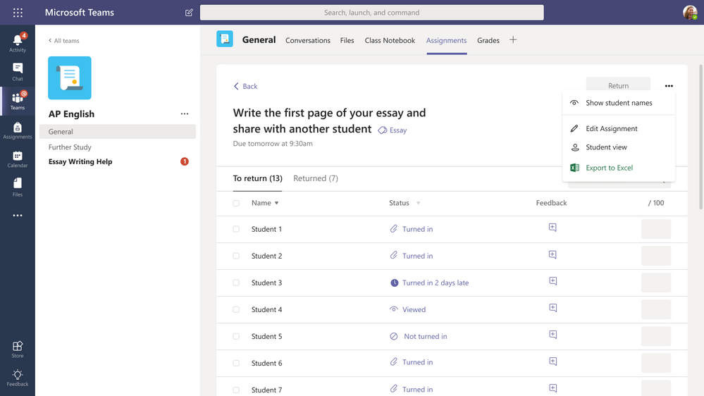 Being able to see what’s upcoming, whether you’re an educator or student, is super important to getting a handle on your week…month…or year. Soon, both educators and students will once again be able to view upcoming and turned in assignments by class or view them across all classes. Just visit Assignments in your app bar on the left hand side of Teams to view assignments across all classes.