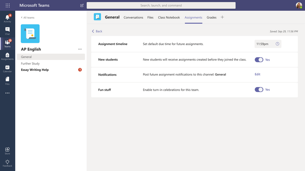 Instead of setting things up on an assignment-by-by-assignment basis, educators can now manage a set of Assignments settings in the Assignments tab. Assignment settings allow educators to set default due times, set preferences of what happens when a new student is added to the class, change where notifications for the assignment will be posted (like an Assignments specific channel), and turn off turn-in celebrations if they’re not age-appropriate for older students. (Settings changes will apply to new assignments created after the settings have been saved.)