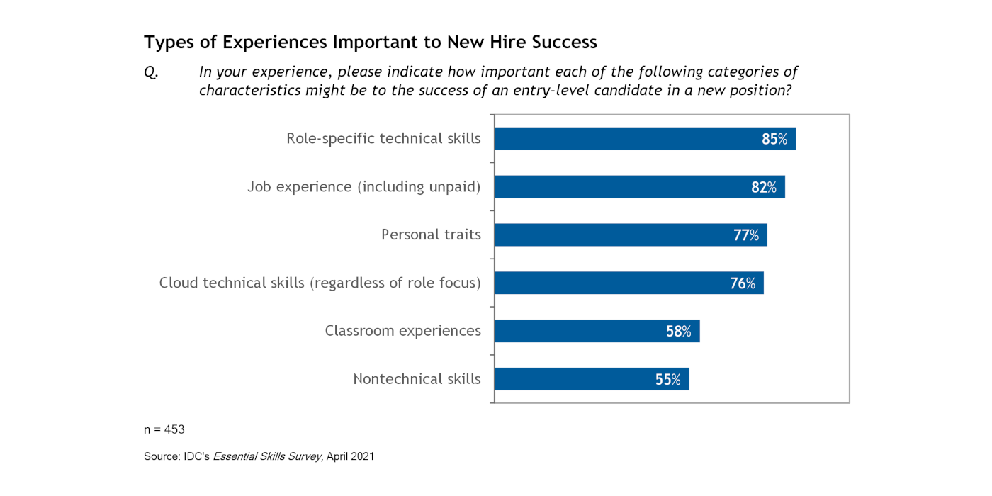 A new IDC white paper, sponsored by Microsoft, titled “Essential Learning: Skills for Early IT Career Success,” provides insights into what defines the most successful and least successful new hires in IT across a variety of industries and geographies. You can view the report here. The study surveyed supervisors from 453 organizations in Australia, New Zealand, the United Kingdom, and the United States who managed 906 entry-level hires. It sought to understand how the educational experiences in and out of the classroom for these new hires impacted their onboarding and impact during their first two years of employment.