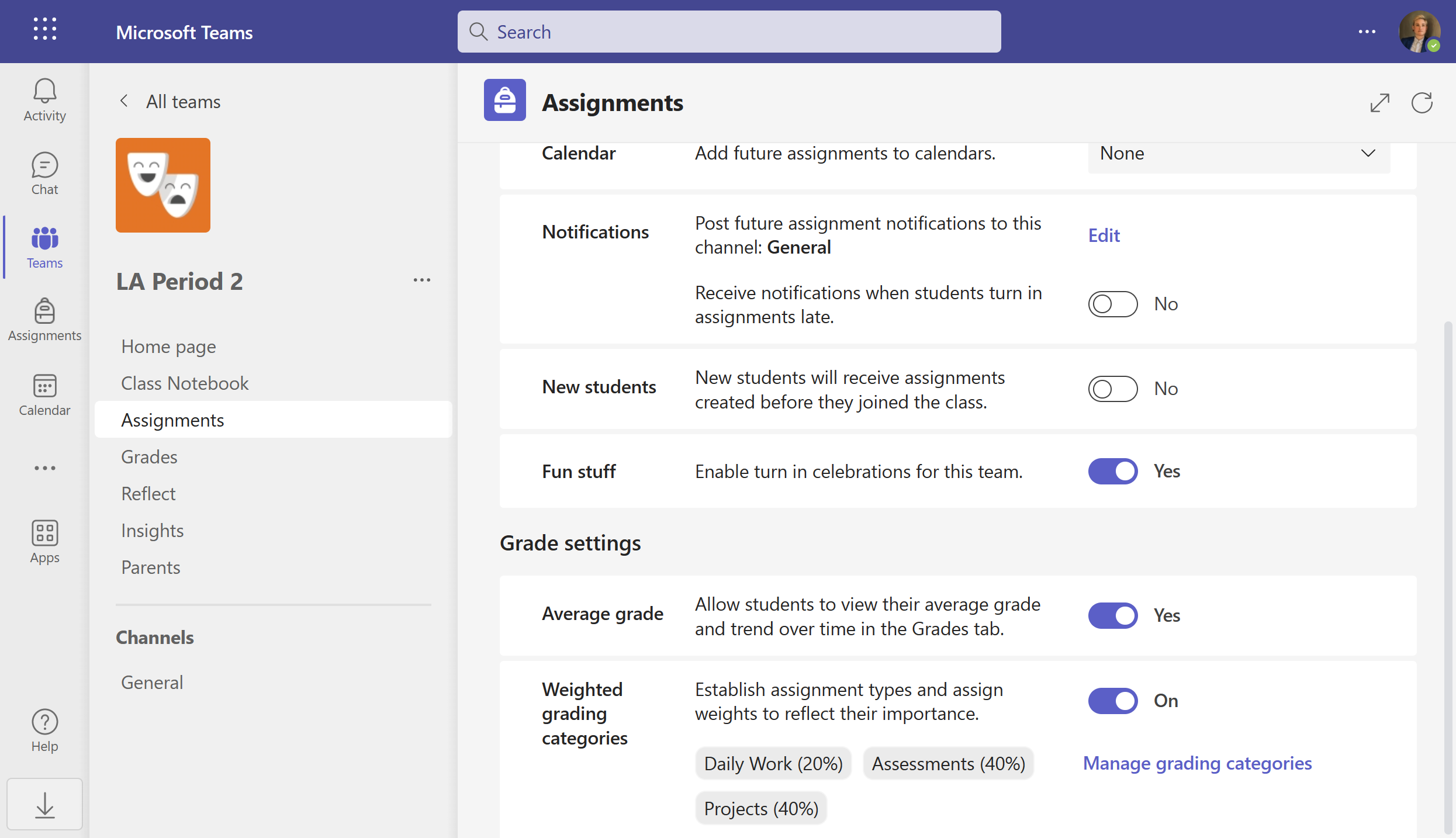 We’ve revamped our grading experience, to make grading in Teams more streamlined and accurate for educators and students. Two new options are available for educators to turn on: weighted categories and average grade.
