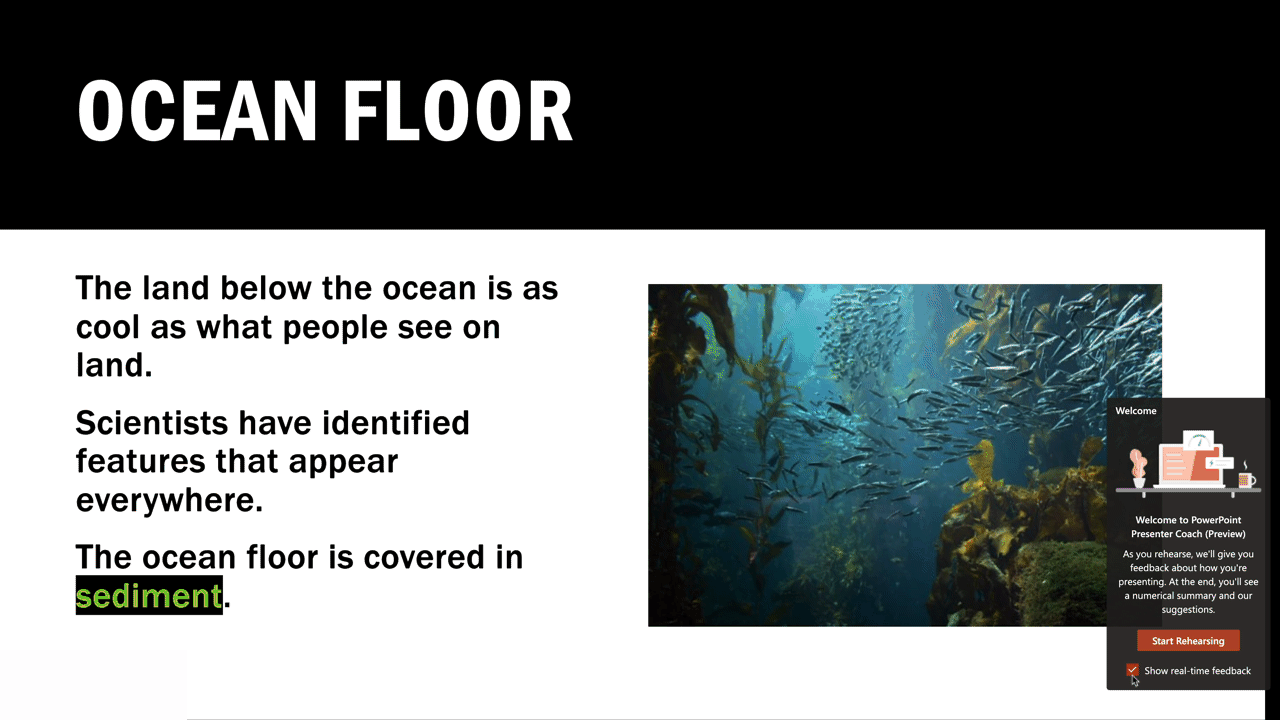 Speaker Coach automatically assesses how information is shared on each slide when a student starts rehearsing. Nobody needs to watch because Speaker Coach tracks everything that’s said and keeps a log of what it notices. It also includes an option to display real-time feedback for those who want to adjust their speech while practicing.