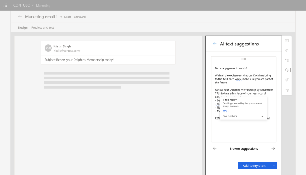 In this hypothetical product, users submit key points, and the system generates text suggestions using GPT-3. The product then flags numbers and dates in the generated suggestions to remind users to check the accuracy of those details, since these are details GPT-3 sometimes gets wrong. This is one way of reporting system performance information (Pattern 2C). ​