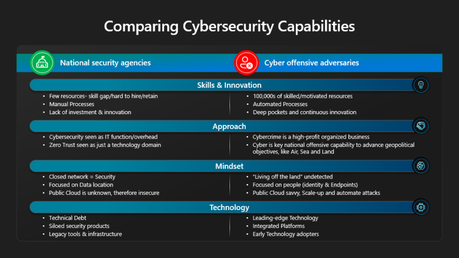 The image below illustrates the differences between the national security agencies and their cyber offensive adversaries in terms of cybersecurity capabilities.