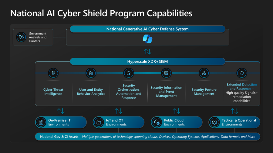 A National AI Cyber Shield System aggregates key security information and event management (SIEM) and extended detection and response system (XDR) hosted on a hyperscale platform, achieving efficiencies of scale and centralized reporting. Government organizations have multiple generations of technology, spanning clouds, devices, and operating systems. The National AI Cyber Shield System monitors those systems, whether on premises, in a public cloud, or elsewhere. The National AI Cyber Shield System provides cyber threat intelligence, behavior analytics, security orchestration, and response, to deliver a unified, comprehensive view of a customer’s security posture.