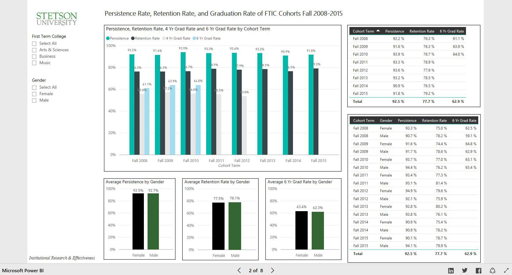 For prospective, current, and former Stetson students, access to university information has improved dramatically. Federally required information such as enrollment trends, retention, and graduation data is more accessible than ever. Before Power BI, the university could make PDFs for people to download, but the data was static and complex. Students can now interact with and explore data online rather than being forced to download information.