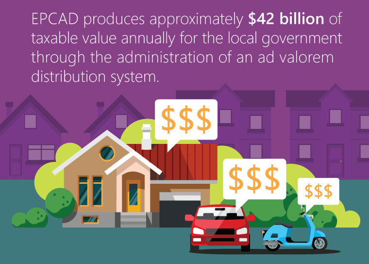 El Paso at a glanceForty-two billion dollars annually. That’s approximately how much in taxable value EPCAD produces for the local government through the administration of an ad valorem distribution system. The district is responsible for appraising all real and business personal property within El Paso County, Texas.