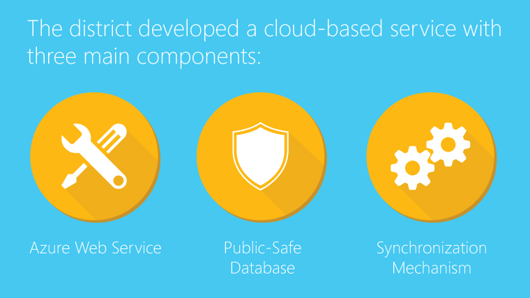 The decision to mold processes around the cloud through Azure in combination with SQL Server led to the district streamlining operations and creating a more stable, reliable infrastructure.An infrastructure overhaulTo accomplish a daily synchronization with an on-site production database, the district developed a cloud-based service with three main components: Azure Web Service, Public-Safe Database, and Synchronization Mechanism.