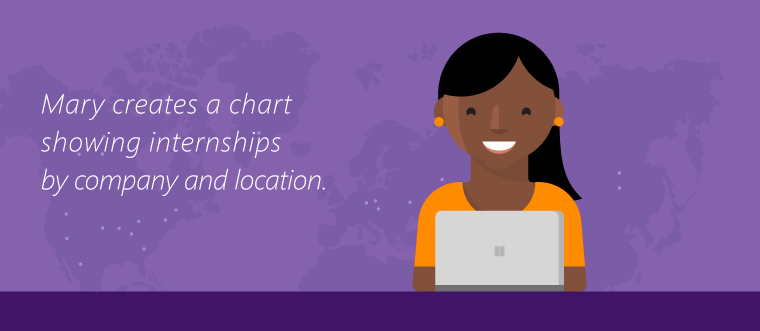 And in the Career Center, Mary is creating a public dashboard that shows internships by college and major for each academic year. She also creates a chart showing internships by company and location, accompanied by maps of the United States and the world that shows where students are working and whether they’re earning college credit. Mary is not a data professional, nor does she work in IT, but the reports are visually appealing and provide much-needed information for students, parents, companies, and other stakeholders.