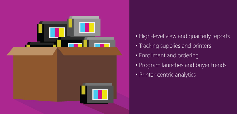 HP’s online database leverages five specific platforms, each serving a specific purpose for the auto-replenishment team. The first dashboard provides a high-level view of the entire program, offering quarterly reports that can be filtered by dates. The second dashboard, primarily used by the sales team, allows employees to track supplies and printers. The third dashboard serves the marketing team, and focuses entirely on enrollment and ordering. The fourth database includes reporting on major events and program launches, offering details on buyer trends to analyze how customers respond to marketing messages. The last dashboard focuses on printer-centric analytics, organizing data on which printers are being ordered the most, cartridge frequency, user trends, and more.