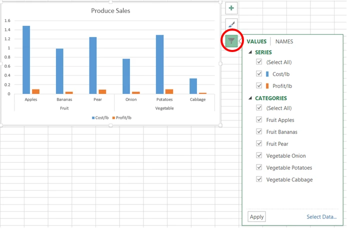 Under Series, uncheck Cost/lb, and then click Apply. The chart reflects your changes.
