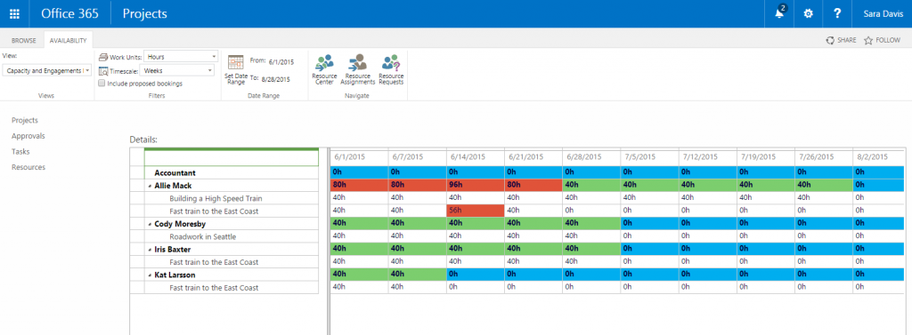 The resource manager (or line manager) is a people manager who may not want to use the full Project client. To allow the resource manager to collaborate with the project manager, Project Online now has an area for the resource manager to view and approve or reject all proposed resource contracts. In addition, the new resource views allow the manager to understand the capacity utilization of their resources at a quick glance.
