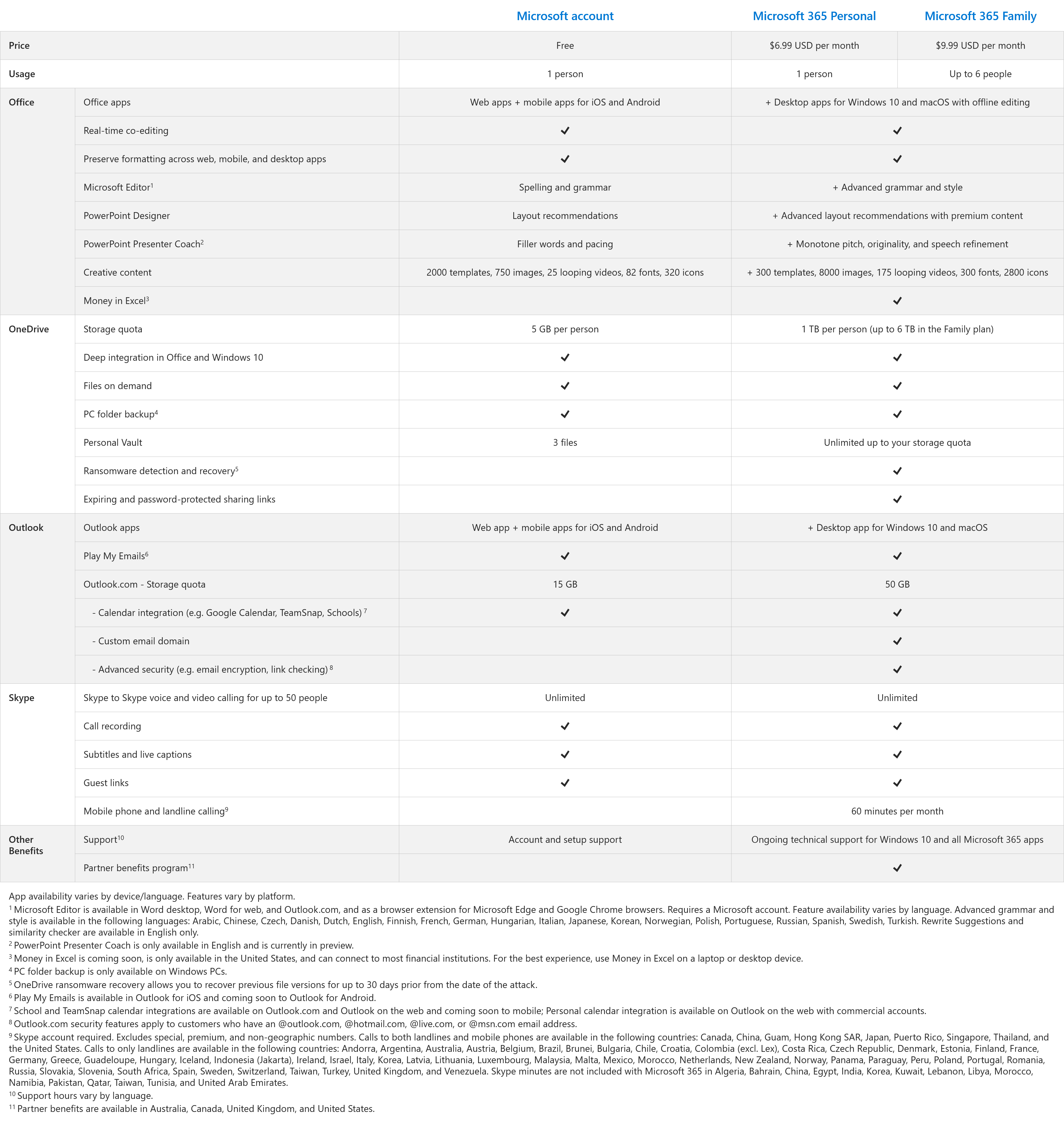 The new Office features start rolling out to current Office 365 customers today. Microsoft 365 Personal and Family subscriptions will be available worldwide on April 21st. With Microsoft 365 Personal and Family subscriptions you get everything in Office 365, like premium desktop Office apps, 1 TB of OneDrive cloud storage per person, 60 Skype minutes for calling mobile phones and landlines, advanced security features to protect you from malware and phishing attacks, ongoing technical support, plus all the new features and benefits announced today. Microsoft 365 Personal costs $6.99 USD a month. For the best value, a family of up to six people can use Microsoft 365 Family for $9.99 USD a month.