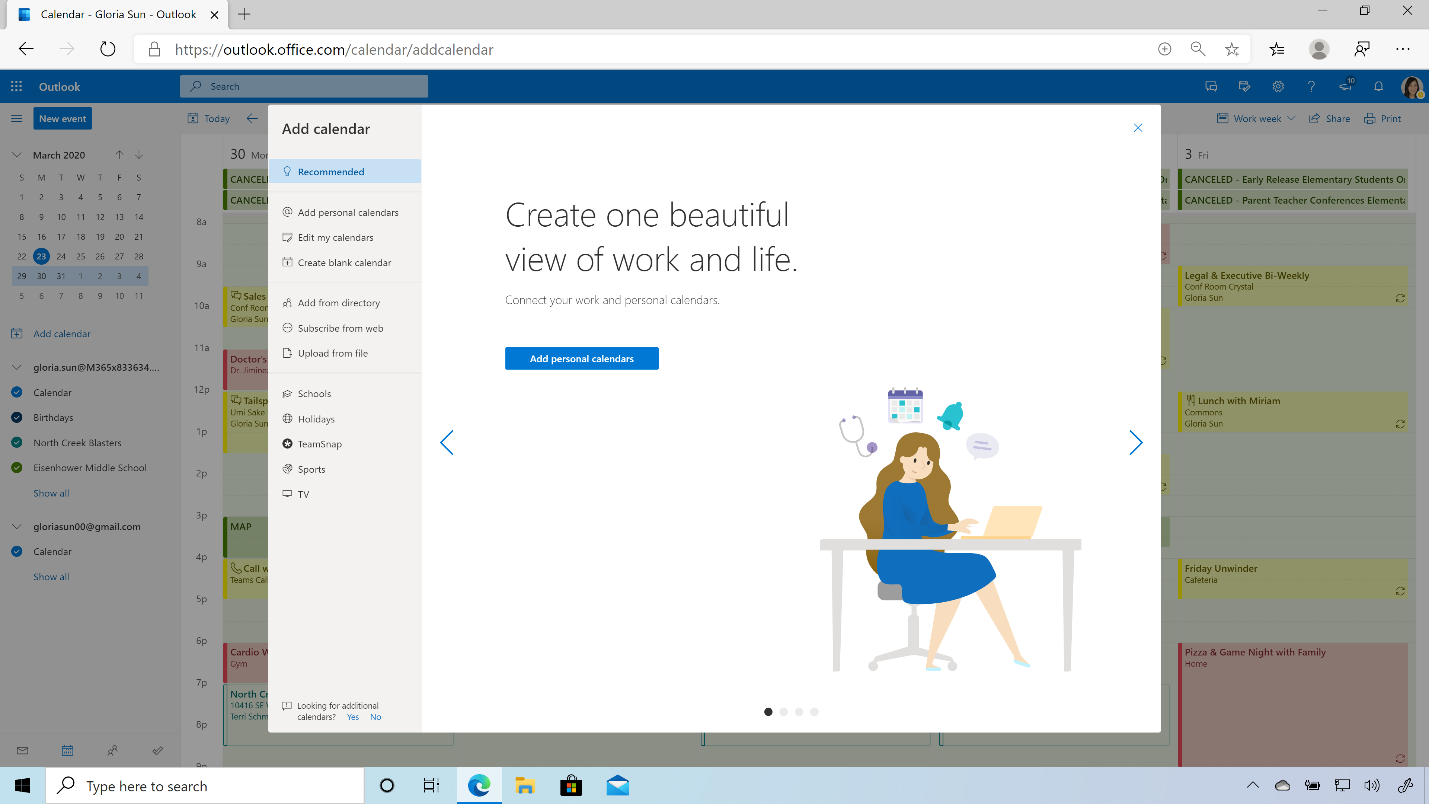 Juggling work meetings with personal appointments can be a struggle, particularly if your work and personal calendars aren’t connected. Today, we announced new features in Outlook on the web that help you manage all your commitments, across your work and life, in one place. With these new features, you can link your personal calendar to your work calendar to show your real availability in your work account, while still maintaining privacy around the details of personal appointments and business meetings.