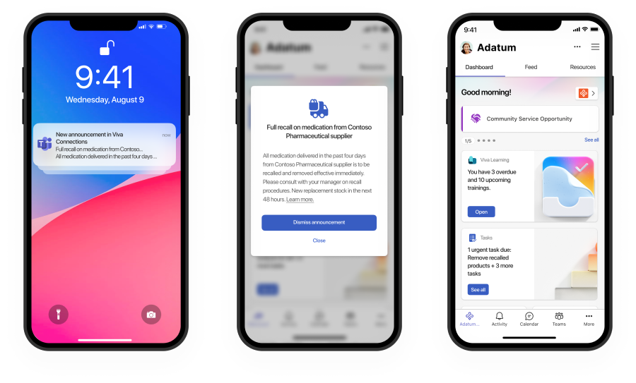 To reduce communication overload and help healthcare workers focus on what’s most relevant to them and their patients, organizational leaders can now target important communications like urgent announcements, role-specific updates, and safety policy changes to care teams and other frontline workers with Announcements in Viva Connections. With these new features, important messages are now delivered through push notifications and communications that surface in the home experience within Teams, where healthcare workers often start their day. Announcements are coming to tablet and mobile experiences in September 2023, with desktop experiences coming later this year.