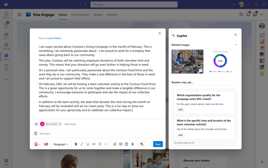 Copilot in Viva Engage providing corporate communicators suggestions for their campaign.