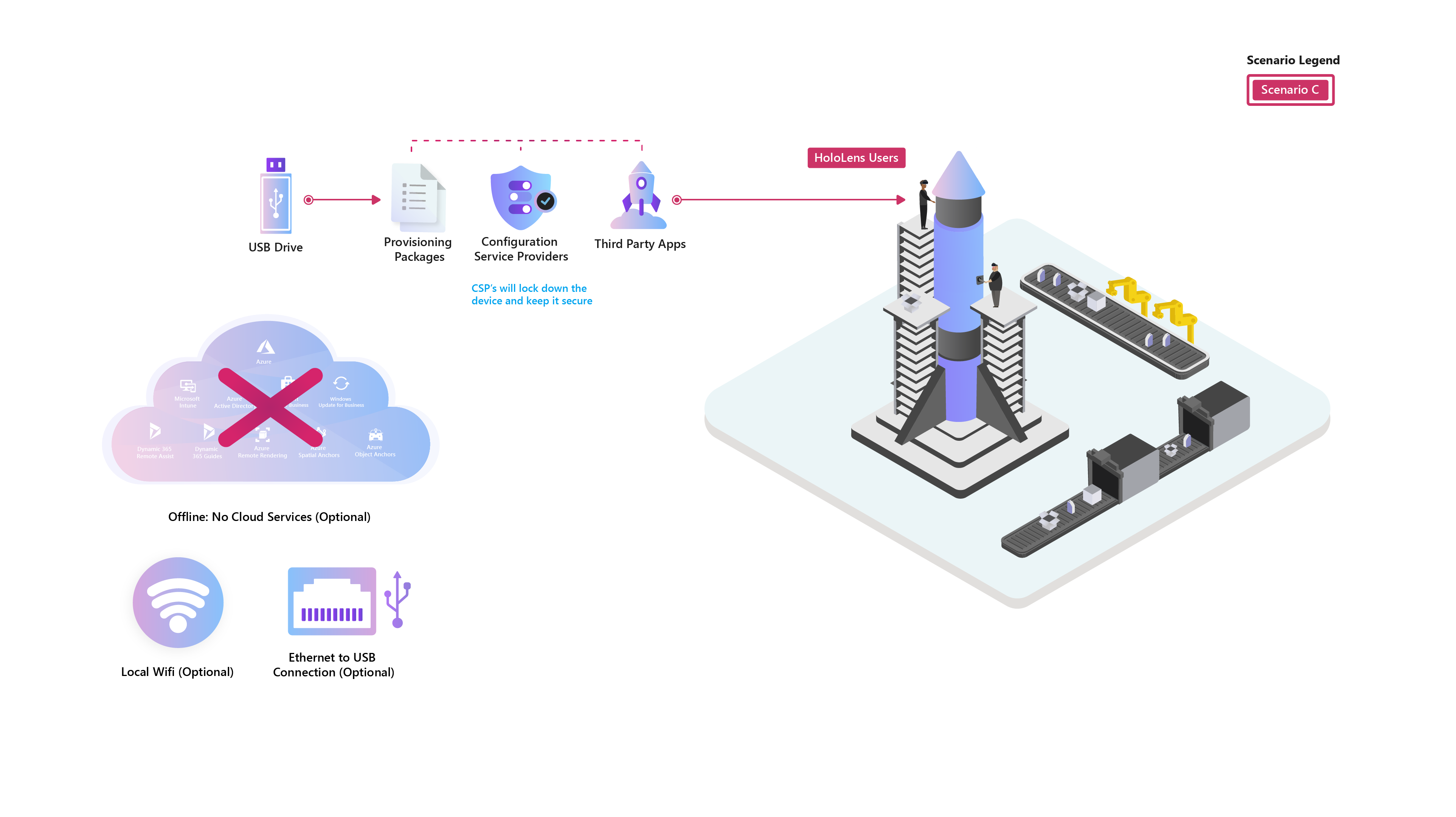 This guide provides guidance for applying a sample Provisioning Package that will lock down a HoloLens 2 for use in secure environments with the following restrictions: