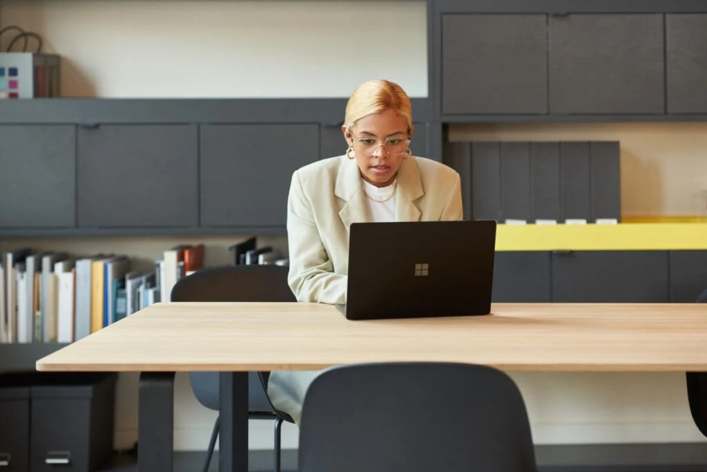 Retail store manager working on a laptop in an office space. Keywords: One person; mobile device; on the go; woman; female manager; furniture; HR; operations; security; Dynamics 365; decision maker