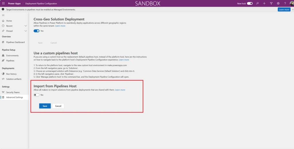 Now, when tenant admins navigate to the Deployment Pipeline Configuration app for the platform host (by clicking “Manage pipelines” from the Pipelines page in make.powerapps.com), they will see a new setting under Advanced Settings. Admins can then provide the environment ID for a custom pipelines host to use instead of the platform host when makers are using pipelines in an environment that has not yet associated with a pipelines host.