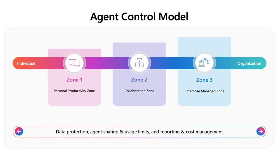 - Zone Three: Enterprise Managed – The most advanced zone, designed for production-grade agents. It includes enhanced security protocols, continuous monitoring, and structured lifecycle management. This zone supports complex, cross-functional and autonomous agent scenarios with full visibility, scalability, and strategic alignment.
