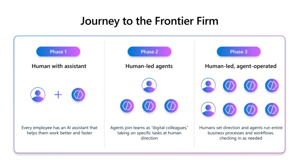 According to Microsoft’s 2025 Work Trend Index, Frontier Firms—organizations powered by intelligence on tap and human-agent teams—are emerging through three phases of AI evolution: from assistants to digital colleagues running entire businesses processes. This progression is redefining collaboration, as humans shift from users to orchestrators of digital labor.