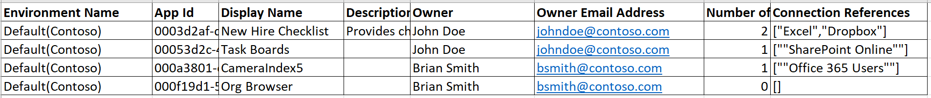 The first column represents the Environment Name in which you can find these apps, followed by App Id and Display Name of the apps. Number of Connections and Connection References indicates the data connections used in the app.