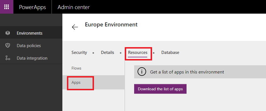 As an environment admin, you can now download a list of apps being created in the environment from the PowerApps admin center. If you are an Office 365 Global admin or an Azure Active Directory tenant admin and you have a PowerApps Plan 2 or Plan 2 trial license, you can download the list of apps for all the environments in your organization. The list contains the app name, the creator of the app, the connector that the app uses to connect to the data source, and other information.