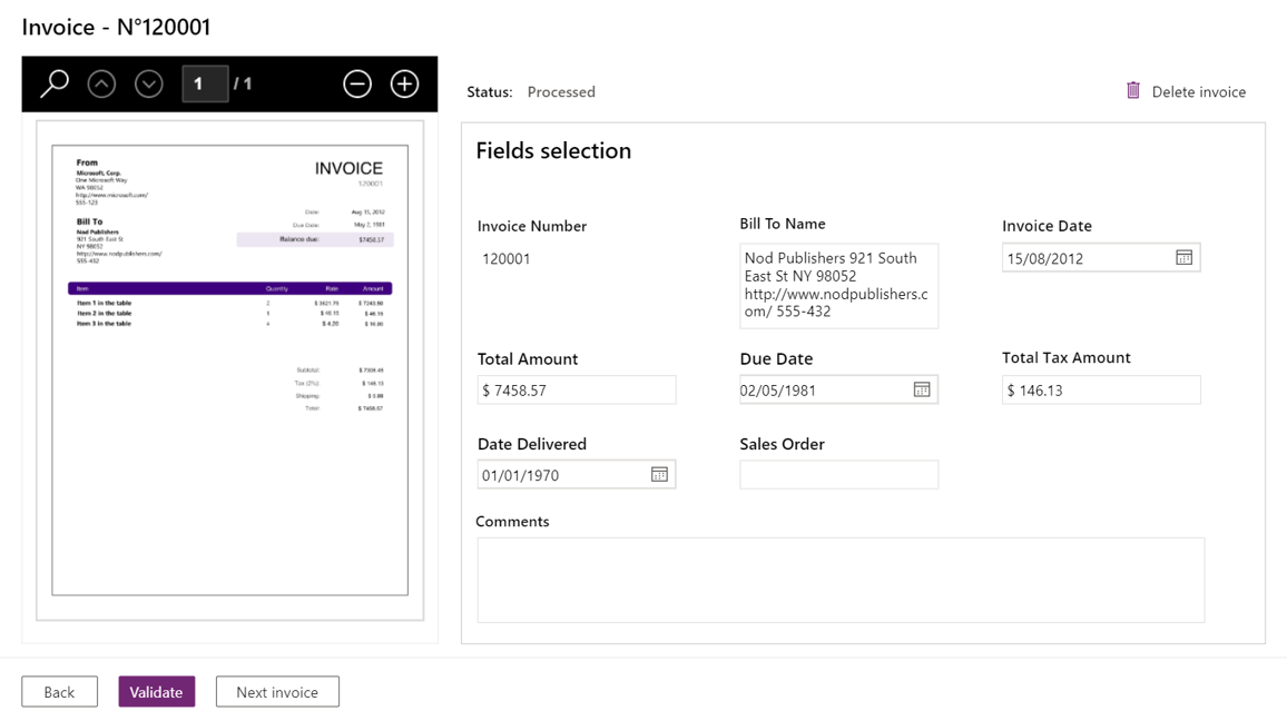 Users can review the extracted fields, perform edits and validate the invoice before the data is sent to the target system.