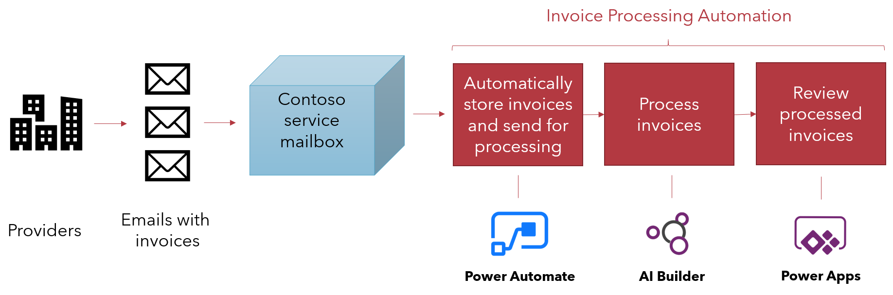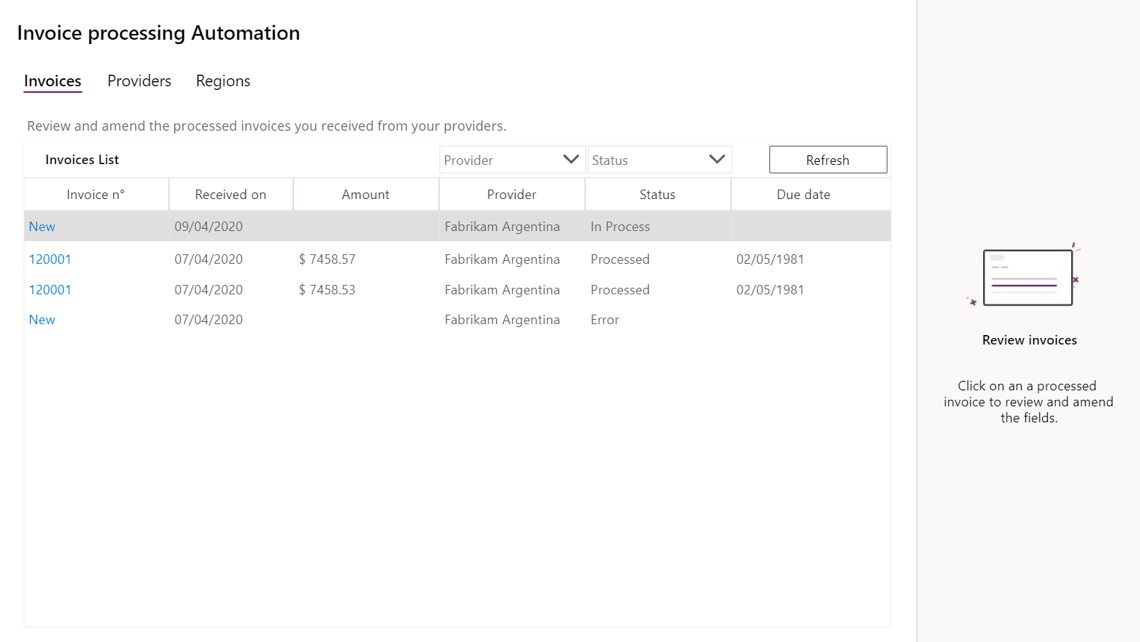 The Invoice Processing Starter Kit leverages AI Builder to extract data from invoices, Power Automate flows for the orchestration, Common Data Service entities to store data and a Power App to configure and monitor the process as well as to review and edit the extracted data. This solution offers a role-based workflow.