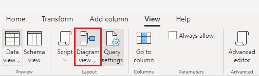 To enable this feature, select ‘Diagram View’ within the ‘View’ tab in the Power Query editor ribbon. Once the Diagram View is enabled, you will start to notice the ‘Diagram View’ panel with the Ribbon on top and Data Preview at the bottom. This feature will be available when you open existing dataflows as well as when you create new dataflows.