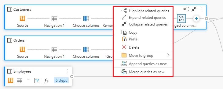 We have now introduced the ability to select multiple queries within the Diagram View through Ctrl + click. Once you multi-select, a right click will show a context menu that will allow performing operations such as merge, append, move to group, expand/collapse and more.